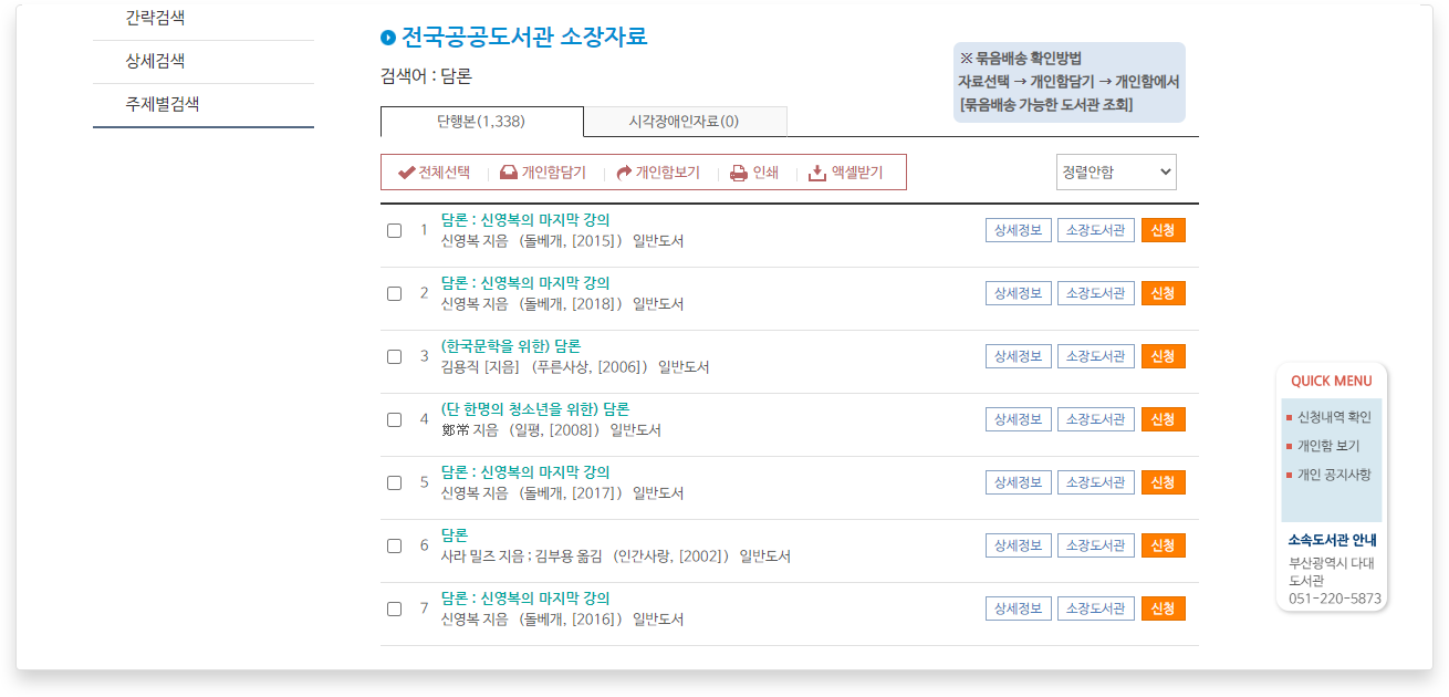 자료검색ㆍ신청 버튼을 클릭해 원하는 도서를 검색합니다.