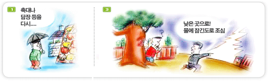 확대보기 1.축대나 담장등르 다시 확인을 합니다. / 3. 천둥이나 번개가 칠때는 우산을 쓰지말고 전신주, 큰 나무 밑은 피하여 낮은 곳으로 가거나 큰 건물안으로 대피하고 물에 잠긴 도로는 가급적 피하고 조그만 개울이라도 건너지 말고 안전한 도로를 이용합시다 .