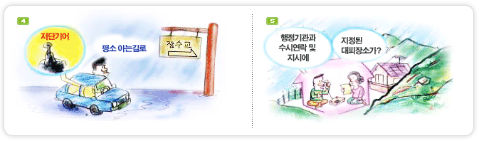 확대보기 4. 잠수교는 피하고 평소아는길로 저단기어로 운전합니다. / 5.행정기관과 수시로 연락을 취하여 권고에 따르도록 하고 비상시 대비 지정된 안전한 장소로 대피합시다.